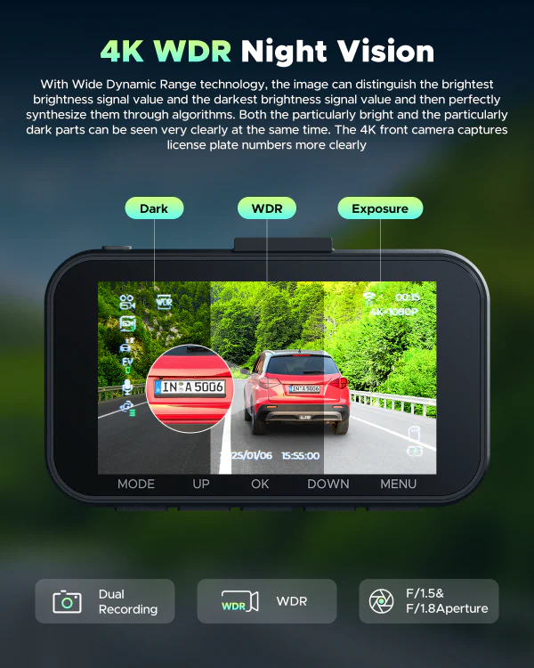 4K UHD 2160P + 1080P Front and Rear Dual Dash Camera for Cars Driving Video Recorder