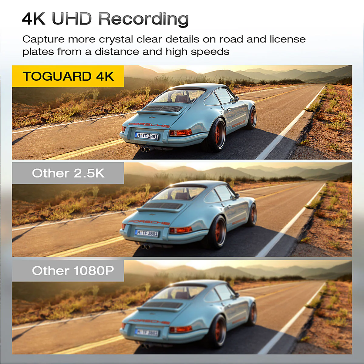 Front camera adopted Sony, captures native 4K UHD footage with clear details. 4K Sony sensor IMX415 on the front camera enhances night vision in low light or rainy conditions efficiently, giving you exceptionally sharp video clips at night. License plates in distance that are unreadable in 1080P or other resolutions are very crisp in 4K video.