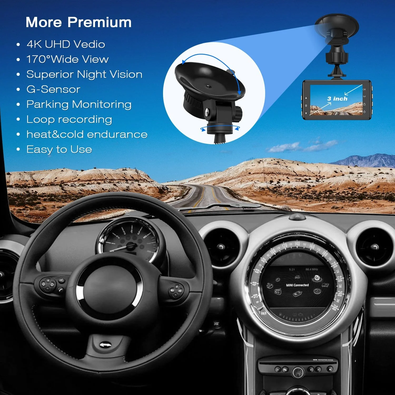 ăUltra HD 4K/25fps ResolutionăThe car recorder has ultra HD 4K resolution and 25 fps video, providing you with excellent picture quality and a true record of every driving process. Provides high-quality footage for any insurance claim. Please use a compatible class 10 high-speed micro sd card, no more than 32GB. (SD card not included!)