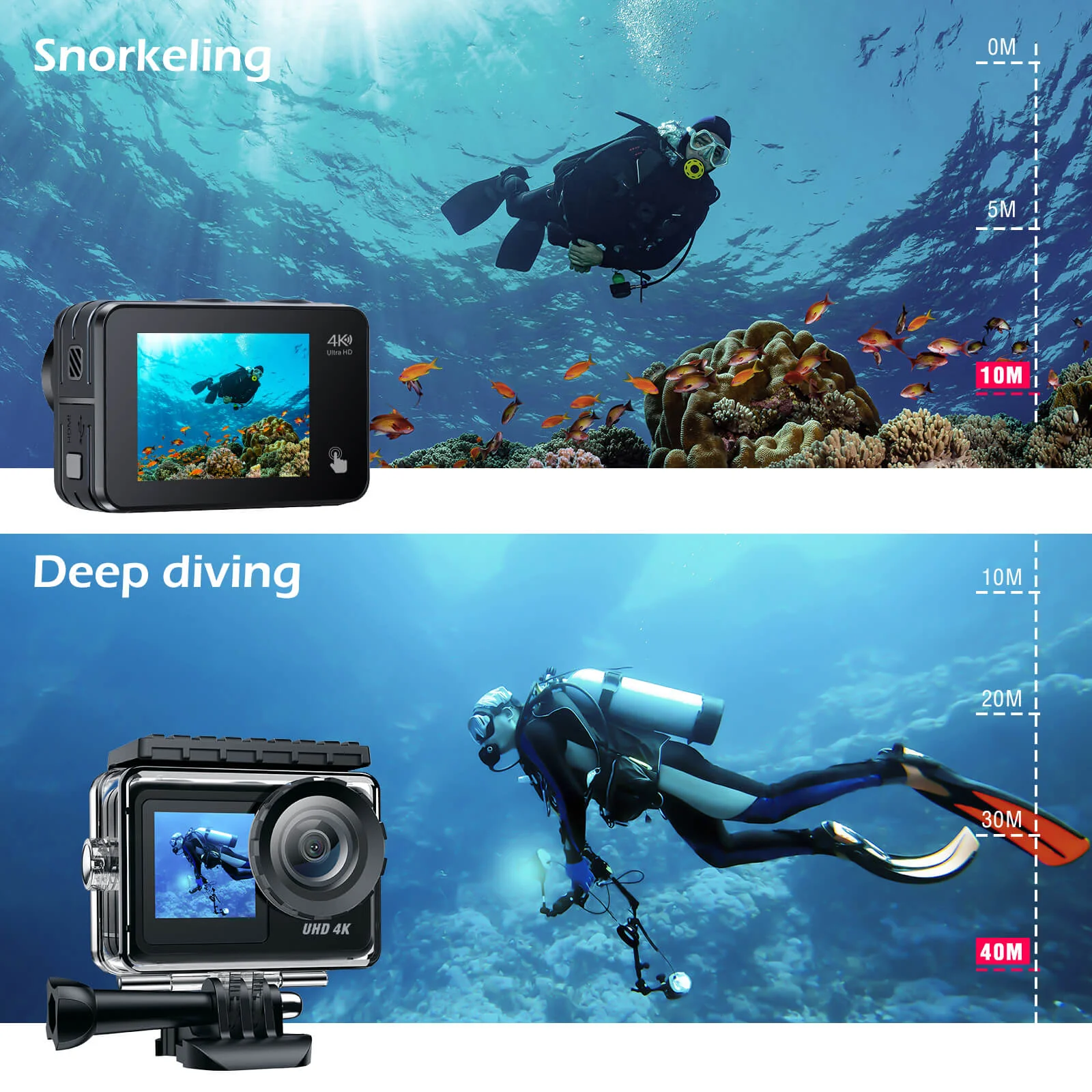 ă33 ft Body Waterproof Camera & 131 ft Waterproof Caseă: 33 ft(10m ) body Waterproof, whether you are swimming, surfing, snorkeling, and other wading sports, it will not affect your recording of beautiful scenery. This underwater camera also comes with a waterproof case, it can deep dive up to 131 ft for adventure.